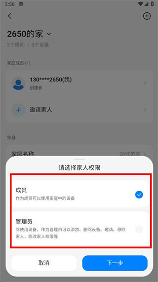 4、在家人權(quán)限選擇頁面選擇成員或管理員權(quán)限后點擊下一步。