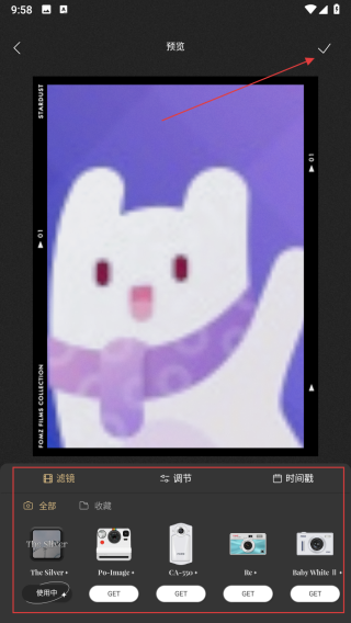 4、在圖片預(yù)覽界面,可選擇濾鏡等效果進(jìn)行調(diào)整,調(diào)整完畢后點擊右上角的對勾按鈕。