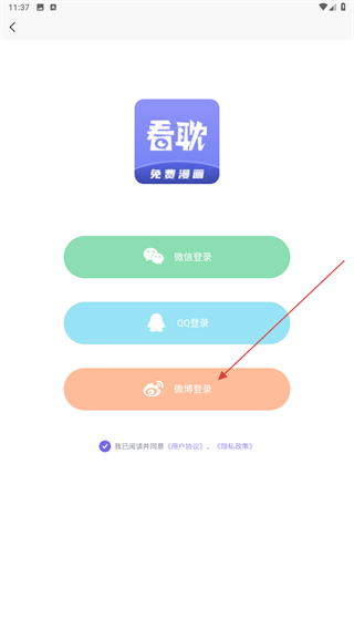 3、在選擇登錄方式的頁(yè)面內(nèi),點(diǎn)擊微博登錄的按鈕。