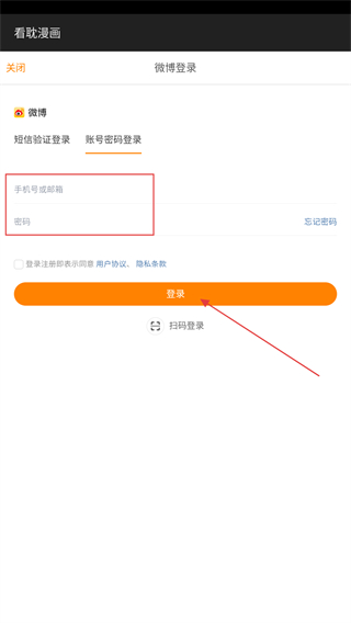 4、進(jìn)入微博登錄的界面內(nèi),輸入手機(jī)號(hào)、密碼,再點(diǎn)擊登錄按鈕。