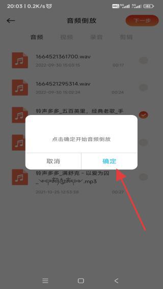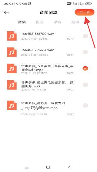 2、在音頻倒放的頁面內(nèi),選擇一個音頻并點擊下一步的按鈕。