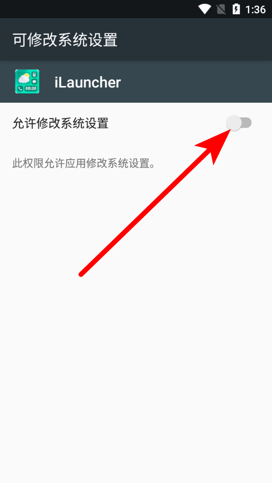 4、在可修改系統(tǒng)設(shè)置界面,找到允許修改系統(tǒng)設(shè)置的開關(guān),將其打開,即可完成iLauncher相關(guān)權(quán)限設(shè)置。