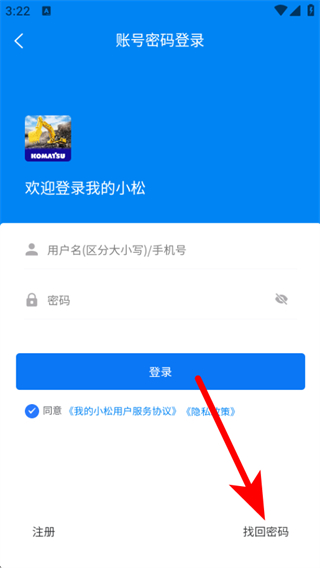 3、在賬號密碼登錄頁面,點(diǎn)擊找回密碼,進(jìn)入找回密碼的頁面。