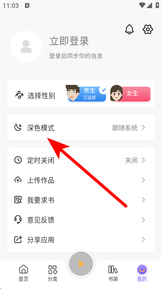 2、在個人界面,點擊深色模式選項,進入深色模式設置頁面。