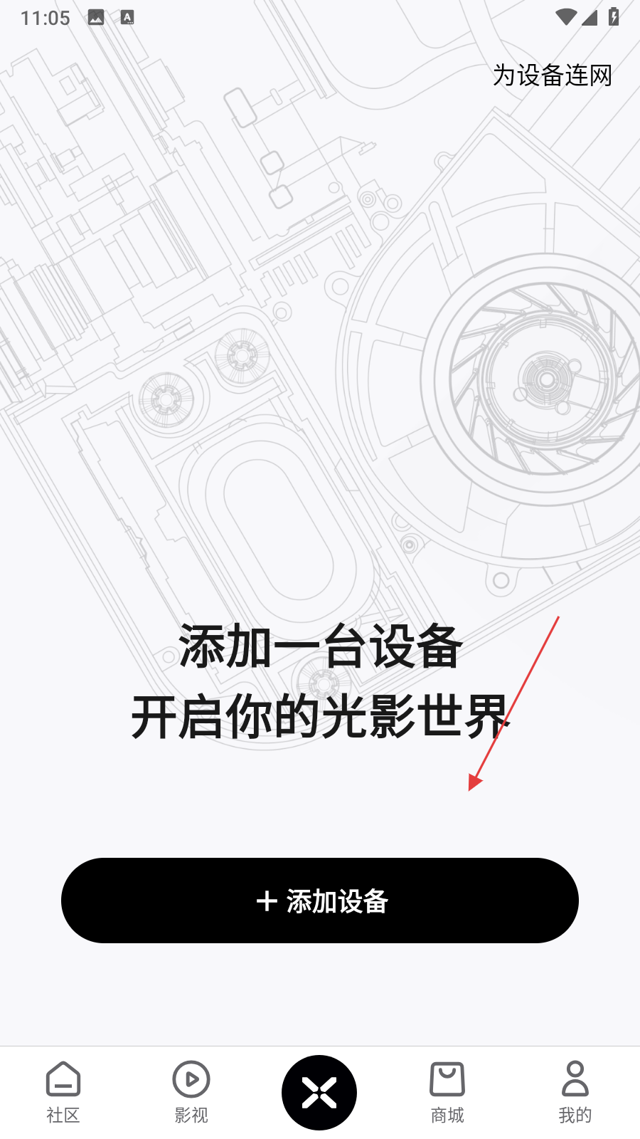 1、打開(kāi)極米相關(guān)APP,點(diǎn)擊頁(yè)面中的添加設(shè)備按鈕,進(jìn)入添加設(shè)備流程。
