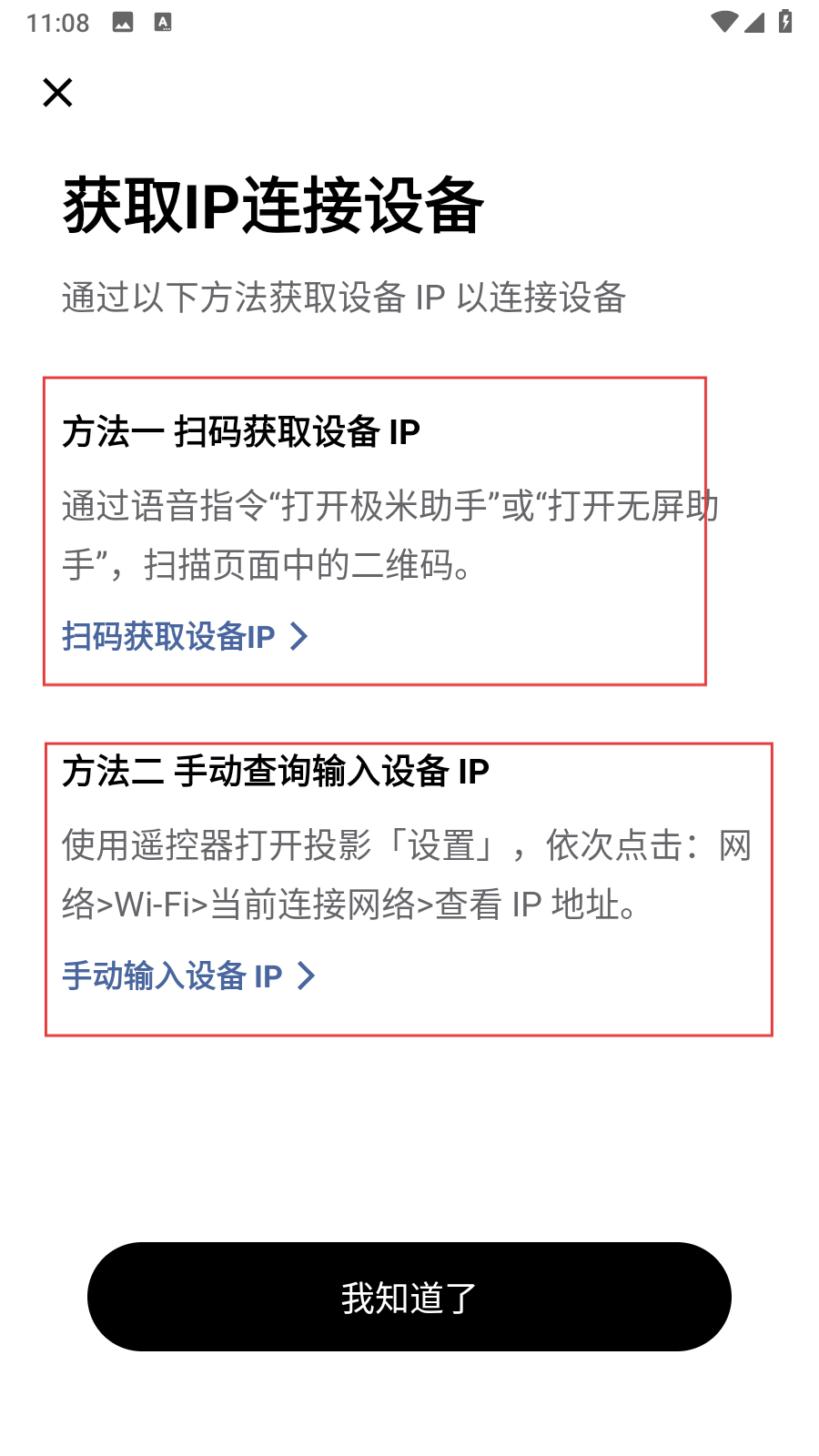 2、在獲取IP連接設(shè)備頁(yè)面,可選擇掃碼獲取設(shè)備IP或手動(dòng)查詢輸入設(shè)備IP的方式來(lái)獲取設(shè)備IP。