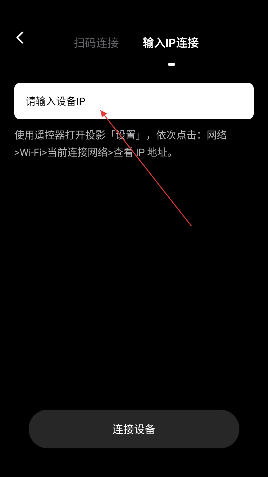 4、切換到輸入IP連接頁(yè)面,在請(qǐng)輸入設(shè)備IP輸入框中輸入投影儀的IP地址,然后點(diǎn)擊連接設(shè)備。