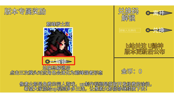 3、然后在兌換碼解鎖的下方輸入兌換碼【蟲(chóng)蟲(chóng)助手玩】就可以成功兌換巔峰穢土斑,可以使用這樣一個(gè)強(qiáng)大的角色;