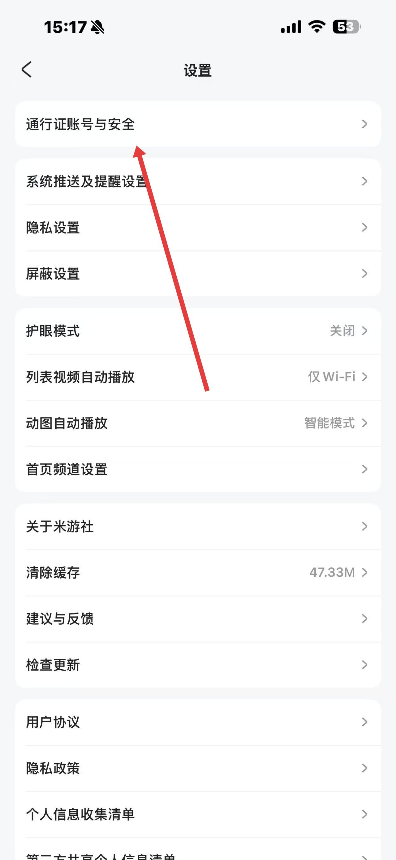 3、在設(shè)置頁面里,點擊通行證賬號與安全選項。