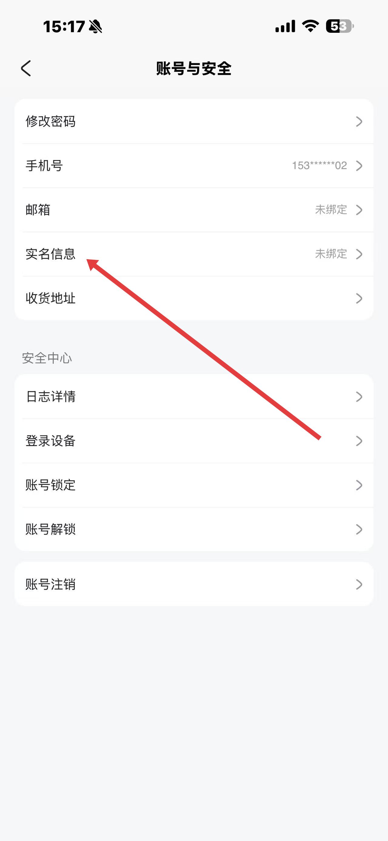 4、進(jìn)入賬號與安全頁面后,點擊實名信息,按提示輸入身份信息完成實名認(rèn)證。
