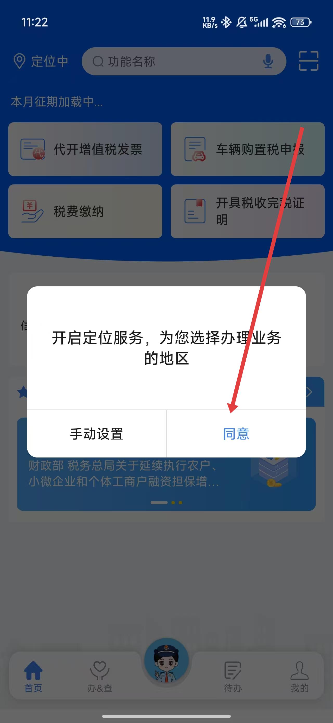 1、在進(jìn)入到電子稅務(wù)局app后,點擊同意按鈕開啟定位服務(wù)后使用app。