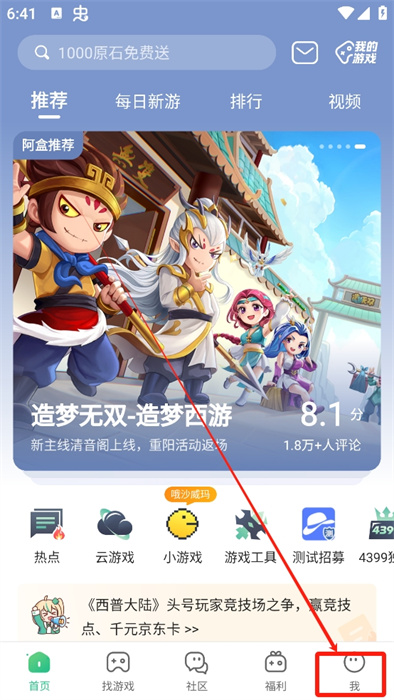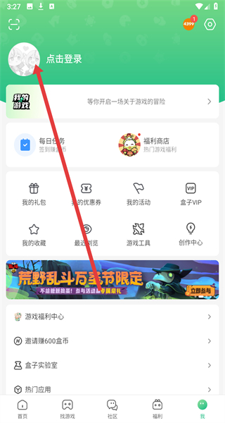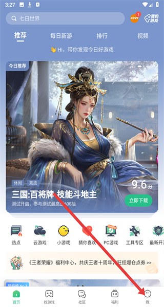 1、打開4399游戲盒子,在這個(gè)盒子中的首頁界面,點(diǎn)擊右下角的【我】進(jìn)入到玩家的個(gè)人主頁;