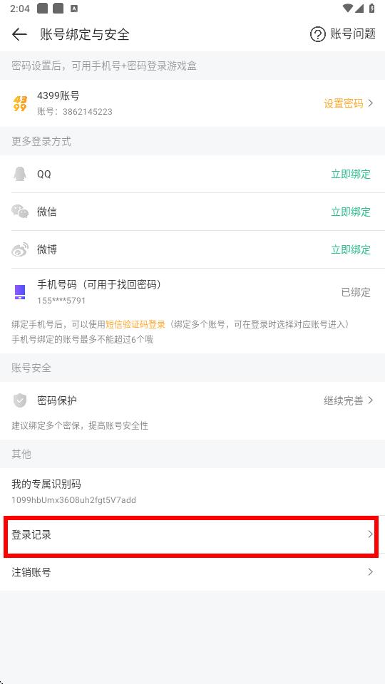 2、在賬號(hào)綁定與安全頁面,點(diǎn)擊登錄記錄選項(xiàng)。