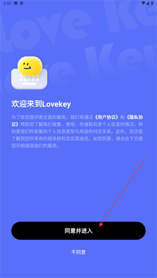 1、打開Lovekey鍵盤APP,進(jìn)入時會彈出用戶協(xié)議與隱私協(xié)議,熟知后點擊同意并進(jìn)入的按鈕。
