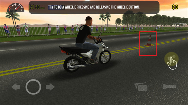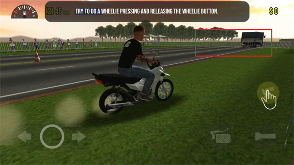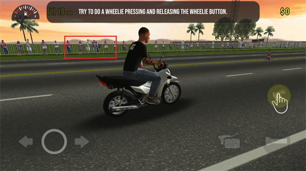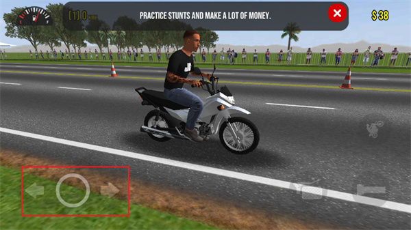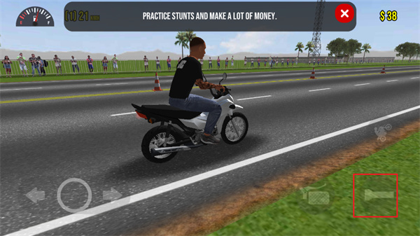 2、右下方的紅色框框內(nèi)按鈕是油門按鈕,玩家點擊該按鈕可以進行摩托車的快速移動;