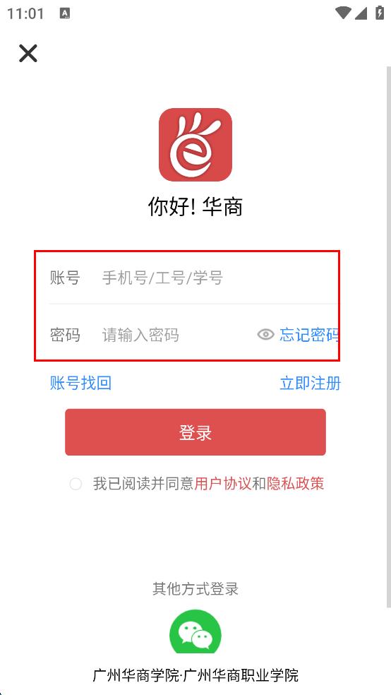 3、在“我”的頁(yè)面,進(jìn)入登錄界面,在“賬號(hào)”欄輸入手機(jī)號(hào)、工號(hào)或?qū)W號(hào),在“密碼”欄輸入密碼。