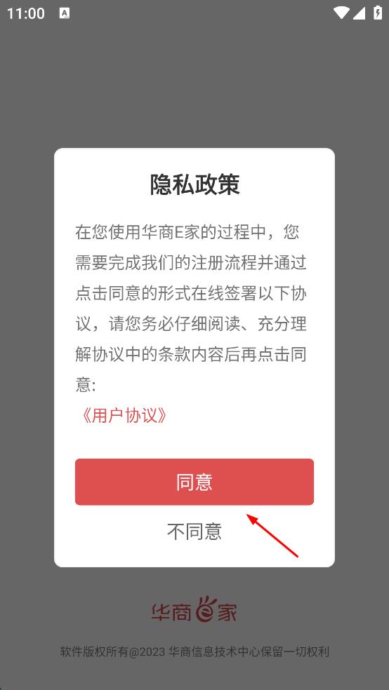 1、打開華商E家APP,出現(xiàn)隱私政策頁(yè)面,仔細(xì)查看后點(diǎn)擊“同意”按鈕。