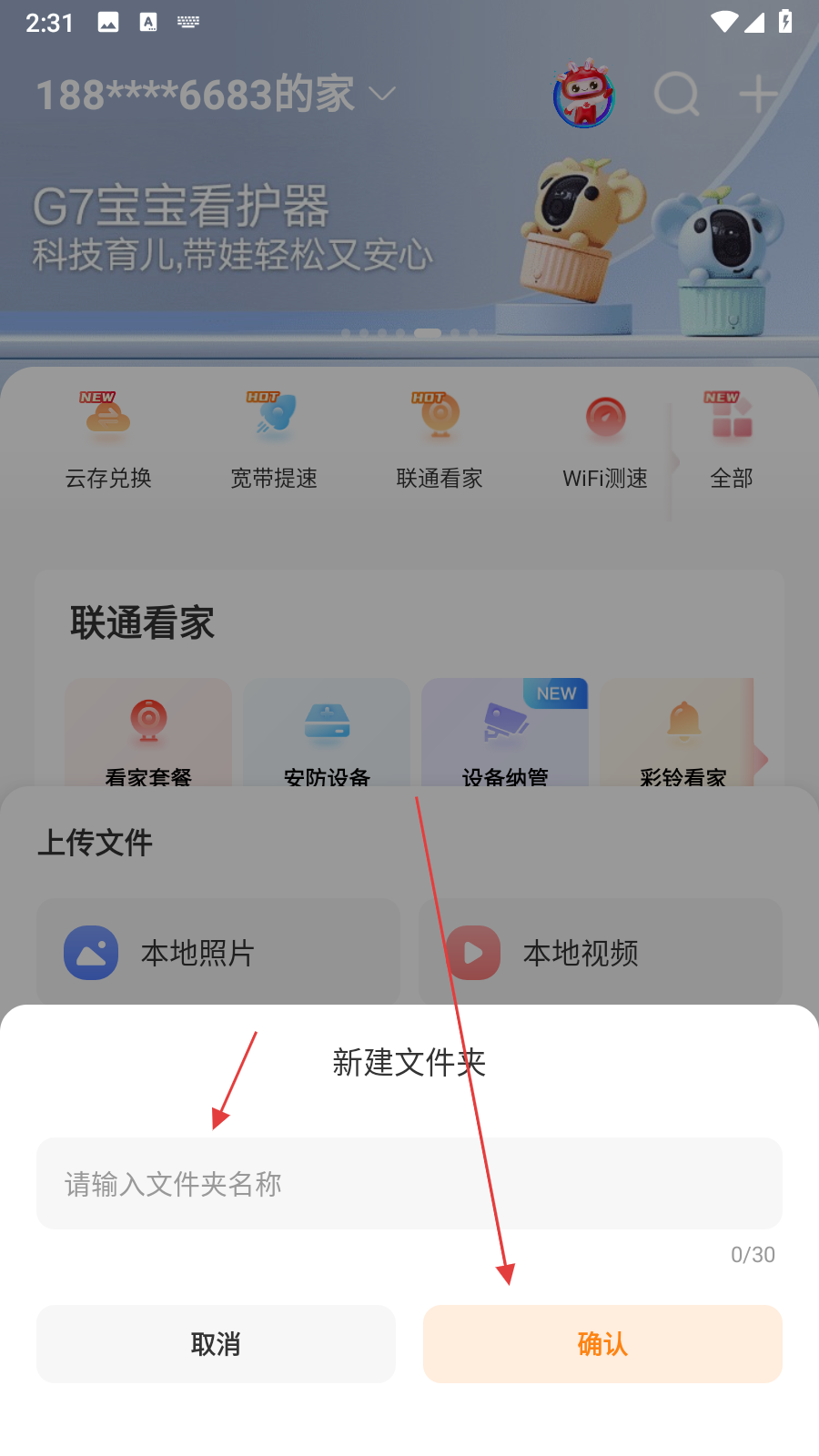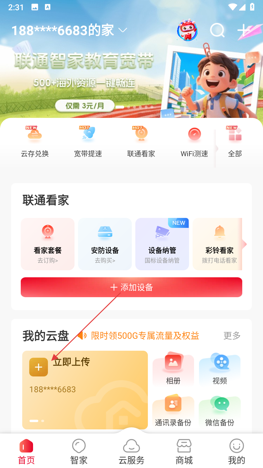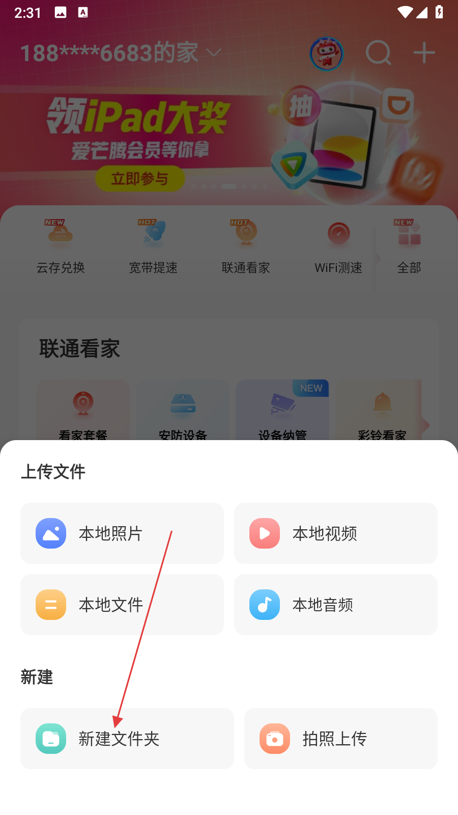 1、打開智慧沃家APP,進入首頁后找到我的云盤板塊,點擊立即上傳按鈕,彈出上傳文件選項。