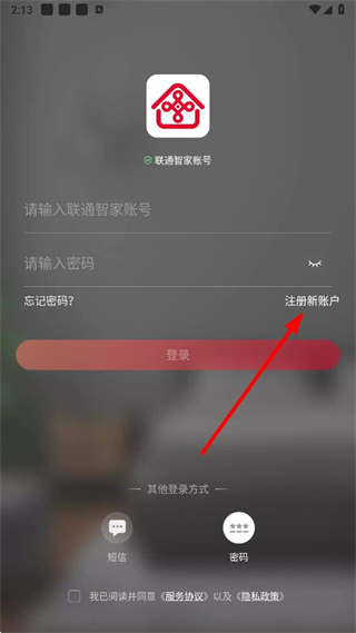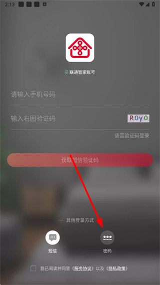 1、在聯(lián)通智家登錄界面,點擊密碼登錄方式,進入對應登錄頁面。