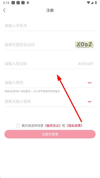 3、在頁面依次輸入手機號、驗證碼,設置密碼,勾選同意服務協(xié)議后,點擊注冊并登錄。