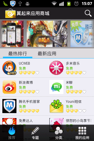 翼起來(lái)是電信為用戶(hù)量身打造的個(gè)性化安卓軟件和游戲的下載平臺(tái),其中集成了當(dāng)前所有熱門(mén)安卓應(yīng)用軟件,如:微信,小鳥(niǎo),僵尸等,也包含所有天翼軟件。系統(tǒng)貼合您的上網(wǎng)習(xí)慣,為您提供一站式的軟件下載、管理服務(wù),讓天翼安卓手機(jī)繽紛無(wú)限,“翼”起來(lái)!