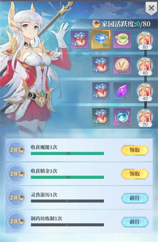 家園任務一共只有四個:收獲魔能、收獲精金、靈獸游歷、制藥坊煉制。每一個任務都非常的簡單!完成后即可獲得全部獎勵!