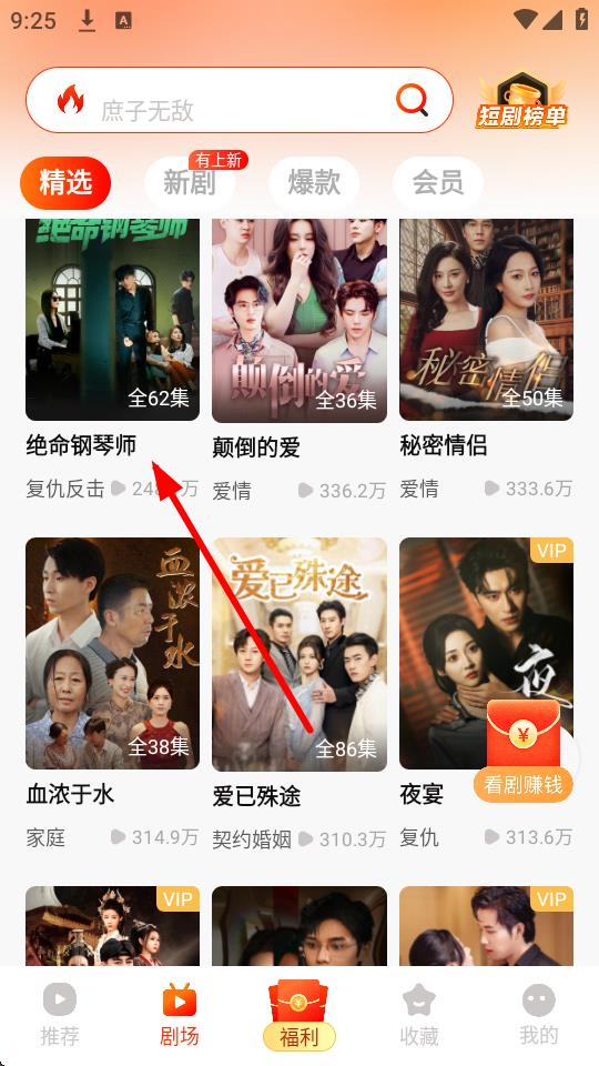 2、在劇場的劇集展示區(qū)域,找到想要觀看的短劇,比如絕命鋼琴師,點擊進入該劇詳情頁。