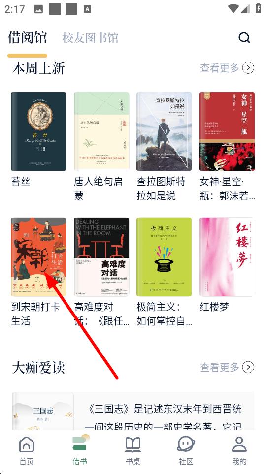1、打開藏書館app,點擊底部導航欄的借書,在頁面中選擇想收聽的書籍,如到宋朝打卡生活。