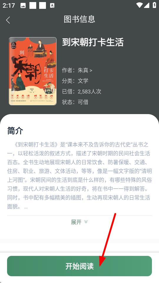2、進入到宋朝打卡生活圖書信息頁面后,點擊開始閱讀按鈕進入閱讀界面。