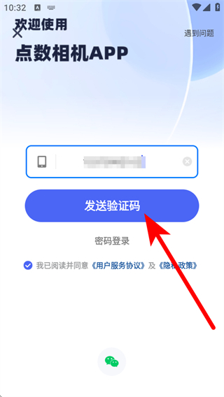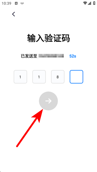 4、在輸入驗(yàn)證碼界面,輸入收到的驗(yàn)證碼后,點(diǎn)擊箭頭按鈕,完成點(diǎn)數(shù)相機(jī)APP賬號(hào)注冊(cè),登錄即注冊(cè)。