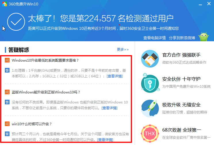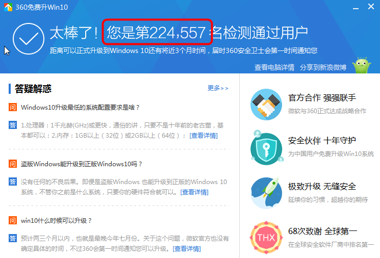 360win10升級檢測工具是360衛(wèi)士的一個小工具,它的作用就是幫助用戶檢測計算機的內存、硬盤、CPU各個參數(shù),然后判定您的系統(tǒng)是否能夠支持和完美運行win10系統(tǒng),(升級請下載360win10升級助手)一鍵檢測非常的方便。360win10升級檢測工具把電腦各個參數(shù)和設置都調整到最合適的狀態(tài),就可以靜靜地等待免費Win10的降臨了。