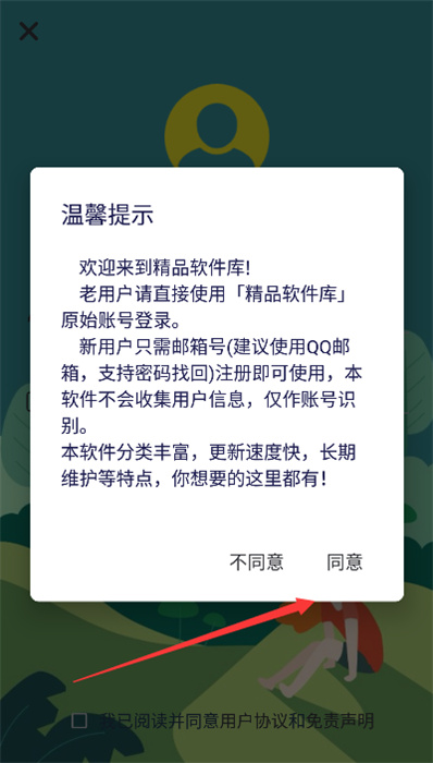2、在軟件注冊(cè)登錄界面,點(diǎn)擊【同意】這樣就可以同意這些條款,才能正常使用軟件;