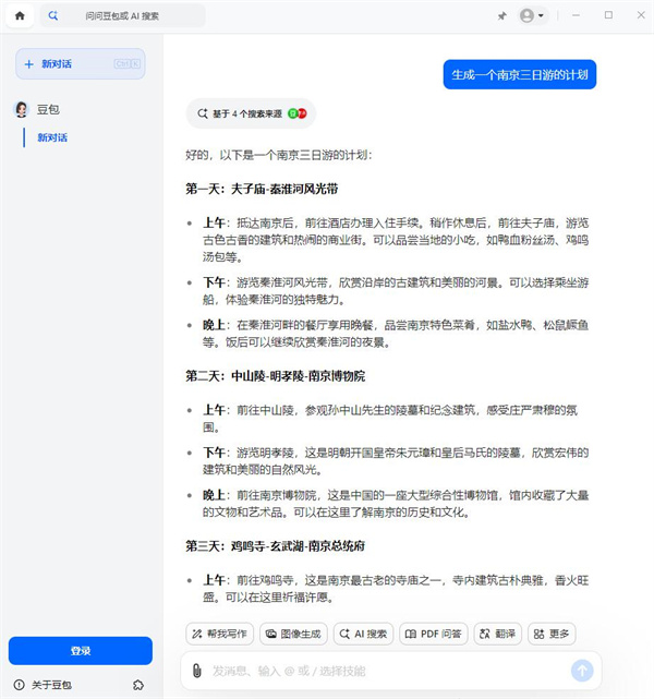 1、在軟件中輸入想要的內(nèi)容,比如【幫助我生成一個(gè)南京三日游的計(jì)劃】,就可以直接得到計(jì)劃;