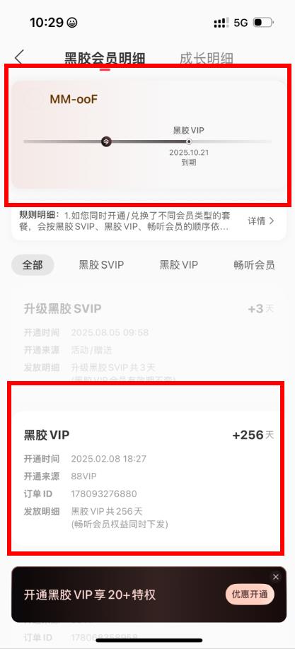 4、在會(huì)員詳情頁(yè)面,就能看到黑膠VIP等會(huì)員類(lèi)型的到期時(shí)間,以及開(kāi)通時(shí)間、開(kāi)通來(lái)源等詳細(xì)信息。
