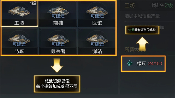 4、城主或者是管理者通過討賊就可以獲得綠瓦,使用資源就可以建造城池,會有多個建筑可以建造;