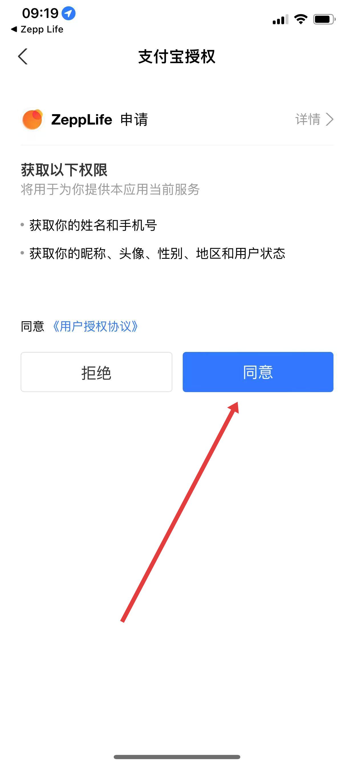 3、點擊頁面下方的綁定按鈕,進入支付寶授權(quán)頁,點擊同意按鈕,完成授權(quán)綁定。