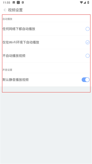 4、在視頻設(shè)置頁面,可選擇自動播放模式,也能調(diào)整默認靜音播放視頻開關(guān)。