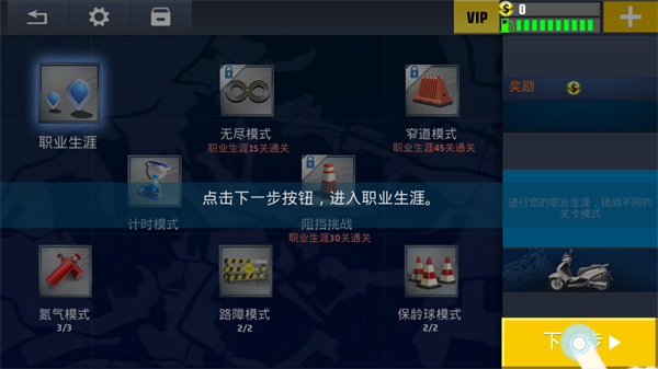 3、然后會進入到一個游戲模式選擇界面,但是我們屬于新手,就需要從最初的職業(yè)生涯開始練習上手,點擊【下一步】開啟比賽;