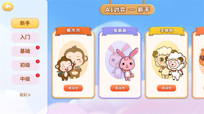 1、AI下棋,小朋友可以選擇對(duì)手角色,選擇困難程度;
