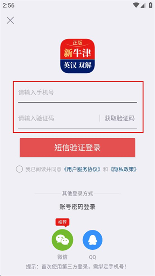 3、在登錄界面輸入手機(jī)號(hào)和驗(yàn)證碼。