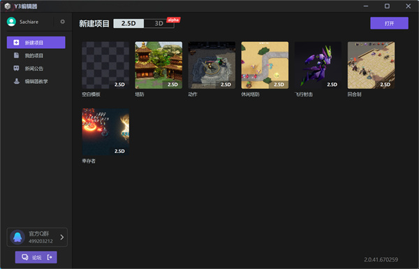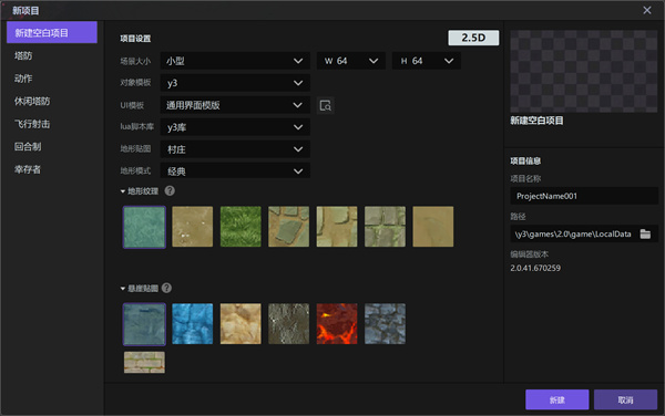 1、打開編輯器就可以進入到【新建項目】界面,在界面中我們可以選擇【2.5d、3d】兩種模式,點擊【空白模版】就可以進入到創(chuàng)建項目詳情頁中;