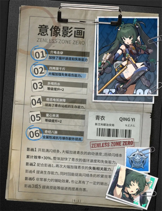 青衣是一位電屬性的擊破代理人。作為首位限定擊破C,青衣主要是通過(guò)普攻、強(qiáng)化特殊技、閃避反擊、終結(jié)技等手段,積累【閃絡(luò)電壓】數(shù)值,在達(dá)到條件時(shí)(【閃絡(luò)電壓】數(shù)值75%+)釋放特殊蓄力普攻將怪物打入失衡并提高其失衡易傷倍率。