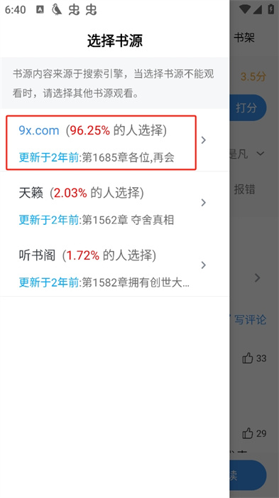4、閱讀的時候需要先選擇書源,因為每一個書源可能細(xì)節(jié)都會不同,可以選擇最上面的書源,也是選擇人數(shù)最多的;