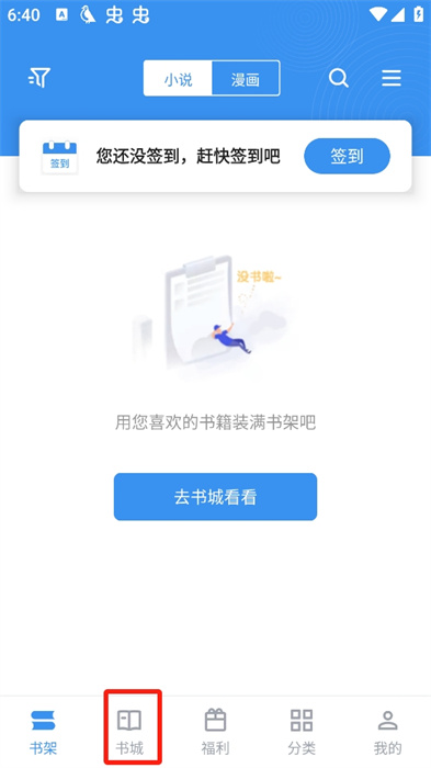 1、在這款優(yōu)秀的手機(jī)軟件主界面中,用戶需要點(diǎn)擊下方的【書城】,進(jìn)入到其中挑選一個小說進(jìn)入閱讀,以此舉例;