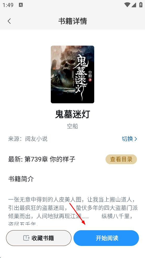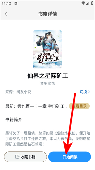 3、進(jìn)入書籍詳情界面,界面展示了小說封面、作者、最新章節(jié)等信息,還有“收藏書籍”“開始閱讀”按鈕,點(diǎn)擊“開始閱讀”按鈕。