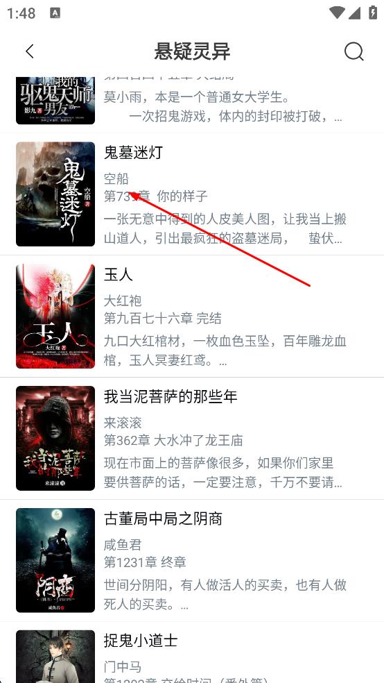 2、進(jìn)入該分類下的小說列表界面,列表展示了多部同類型的小說,找到想要閱讀的小說,點(diǎn)擊該小說。