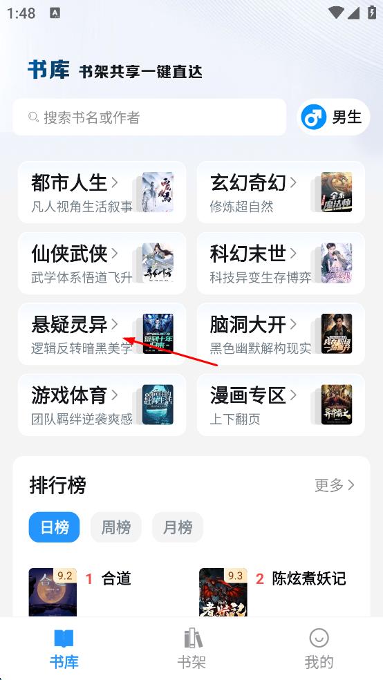 1、打開小說閱讀軟件,進(jìn)入書庫界面,界面有“都市人生”“玄幻奇幻”等小說分類,還有排行榜板塊,點(diǎn)擊感興趣的分類。