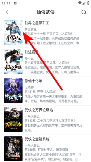 1、在仙俠武俠分類頁面,點(diǎn)擊想看的書籍封面,進(jìn)入書籍詳情頁面。
