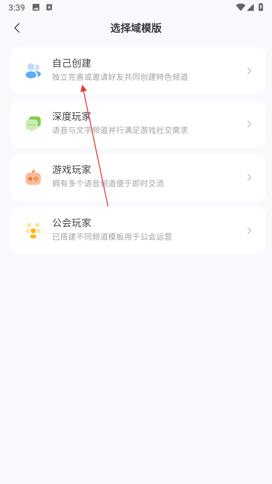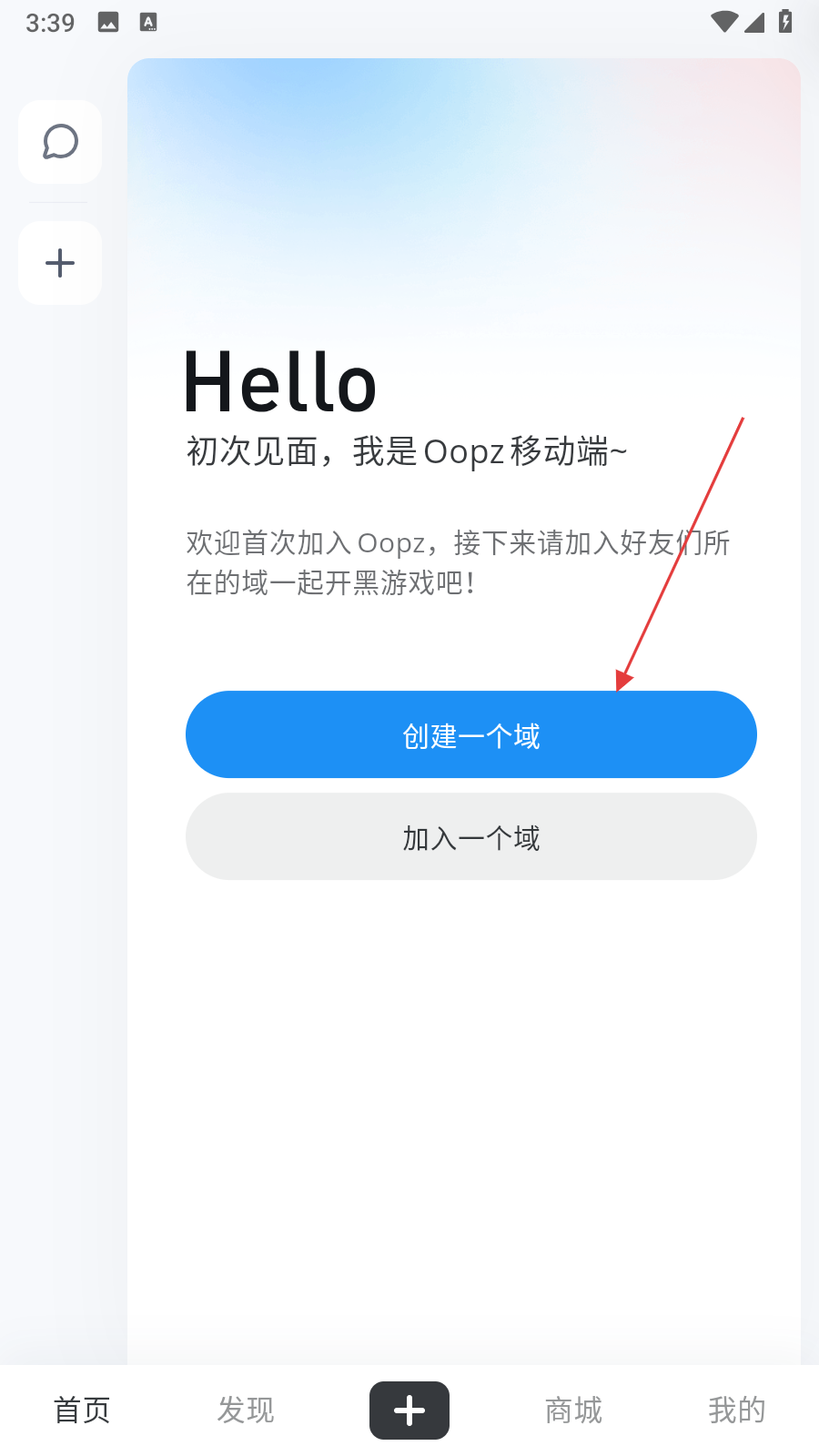 1、打開Oopz應(yīng)用,在應(yīng)用初始界面找到創(chuàng)建一個域按鈕,點(diǎn)擊該按鈕進(jìn)入選擇域模版頁面。
