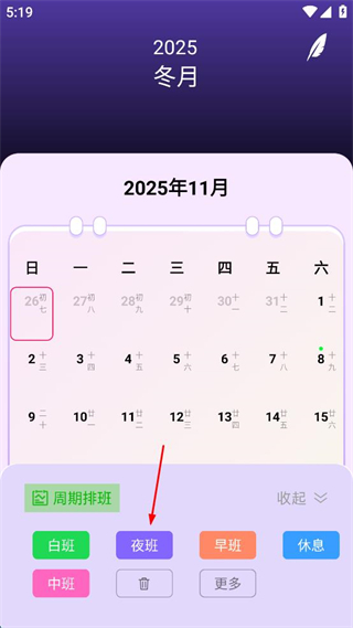 2、在彈出的排班選項(xiàng)中,點(diǎn)擊夜班按鈕,將26日設(shè)置為夜班。